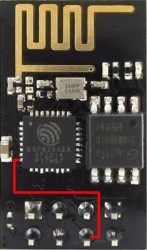 Um den ESP-01 aus dem Deep-Sleep-Modus zu katapultieren muss RST einen Low-Pegel erhalten, dieser wird nach Ablauf der Deep-Sleep-Zeit vom Pin XPD_DCDC des ESP-Chips geliefert. Leider ist dieser nicht nach außen auf einen Anschlussspin geführt und man muss somit die Brücke direkt auf dem Board löten. Das Unterfangen ist allerdings nur was für geübte Löter mit ruhiger Hand.