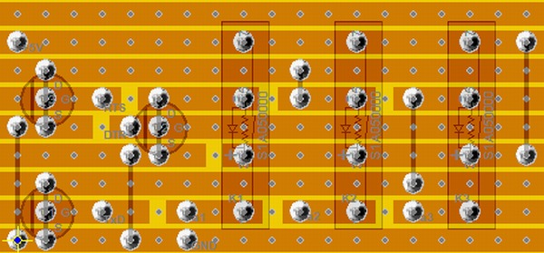 Auslegung auf einer Lochstreifenplatine. Außer den drei