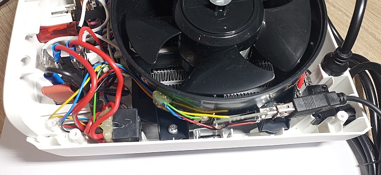 Nach dem der elektronische Teil erledigt ist, kann man sich an der klassische Elektrik zu schaffen machen. Ich möchte hier gar nicht zu arg ins Detail gehen, da wohl jeder Heizlüfter etwas anders aufgebaut sein wird. Aber eines sollte bei allen gleich sein. Irgendwo kommt die Zuleitung (oder auch mehrere) auf den Wahlschalter, diesen greift man ab und legt in auf den Steller des Relais. Den Schließerkontakt legt man dann auf die entsprechend geschalteten Ausgänge des Wahlschalters, quasi parallel dazu. Somit kann der Heizlüfter wahlweise manuell oder über die Steuerung betrieben werden. Hier mal ein Bild von meinem Kunstwerk: