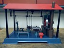 | Die Wilesco Werkstatt D141, hier D141/66 ist ein Sondermodell auf Basis der D14 Dampfmaschine. Interessanter weise lässt sich dieses Sondermodell wesentlich häufiger antreffen als das Basismodell D14. Auf der deutlich erweiterten Grundplatte mit Dach befinden sich vier fest montierte Standmodelle aus der Wilesco Standmodellserie, sowie bei der D141/66 zusätzlich der Generator D66 und Werkstattleuchte. | ||||||||