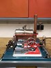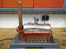 | Die D32 besitzt den gleichen ventilgesteuerten, doppeltwirkenden Zylinder wie die D20/24/28, jedoch gleich zwei davon (der linke in gespiegelter Ausführung). Die D32 ist die größte von Wilesco gebaute Dampfmaschine, ein Wahrer Koloss. Sie hat den größten Kessel des Wilesco-Programms, besitzt einen Drehzahlmesser, Speisewasserpumpe und eine über Reibkupplung zu- und abschaltbare Antriebswelle. Diese Funktionen sucht man bei anderen Modellen von Wilesco vergeblich. Die hier ausgestellte Maschine stammt aus den 60'er Jahren. | ||||||||