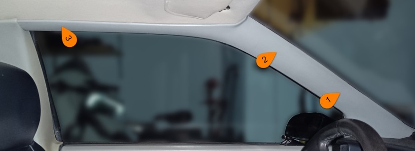 Die A-Säulen- und Dachhimmelblende besitzt 3 befestigungspunkte zur Karosserie. Je zwei Klammern (1) und (2) und eine Einstecklasche in hinterem Bereich (3).