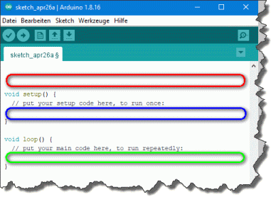 Bevor es nun richtig los geht noch ein paar Worte zum Code-Aufbau und Seriellen-Monitor. Der Sketch teilt sich im groben in drei Bereiche auf. Ganz oben (rot) werden die für das Programm benötigten Module (Libraries) eingetragen und globale Variable und Konstante gesetzt. Bei "void setup()" (blau) kommen initialisierende Anweisungen hin, die nur beim Programmstart abgearbeitet werden. z.B. das Starten des WLAN, Webserver,... und auch das Initialisieren des Serial-Monitors, dazu gleich mehr. Im dritten Abschnitt "void loop()" (grün) kommt der sich wiederholende Programmteil hin. Also Warten auf Ereignisse und die Reaktionen darauf. All das wird beim nächsten Punkt "WLAN" sich verdeutlichen.