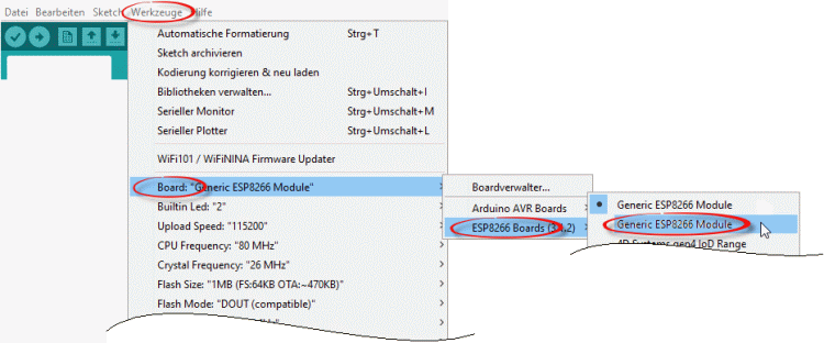 D1-Mini, jedoch muss hier anstatt "LOLIN(WEMOS) D1 mini (clone)" das "Generic