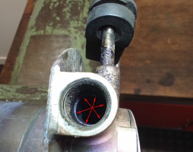 Das Bild zeigt die Glühkerzenbohrung des ausgebauten Brenners mit entnommenem