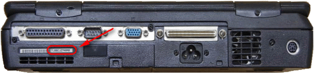 Hinterseite des Laptops, oberhalb der Lüftungsschlitze. Es ist ein länglicher weißer Aufkleber, die Nummer steht hinter dem Barcode.