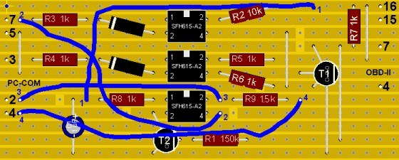 Nachdem die Platine bestückt und die Leiterbahnen an den angegebenen Stellen durchtrennt sind, können die Stecker angelötet werden. Wie im Layoutbild zu erkennen, wird der PC-COM Stecker an der linken und der ODB2-Stecker an der Rechten Seite der Platine angeschlossen. Bitte darauf achten, dass in der bildlichen Darstellung die Stecker von der Lötanschlussseite gezeigt sind und nicht wie üblich von der Kontaktseite. Dies erleichtern meines Erachtens das finden der richtigen Pins.