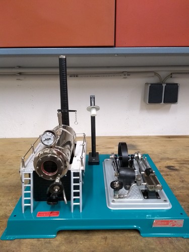 | Die D18 besitzt den gleichen ventilgesteuerten, doppeltwirkenden Zylinder wie die D16, jedoch unverkleidet. Den Kessel teilt sie sich mit der D12/20/22. Auf der Antriebsplatte ist werksseitig der Generator D66 verbaut welcher ein kleines Straßenlaternenmodell mehr oder weniger zum leuchten bringt. Die hier ausgestellte Maschine wurde anfangs der 2000'er Jahre produziert. | ||||||||