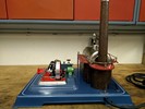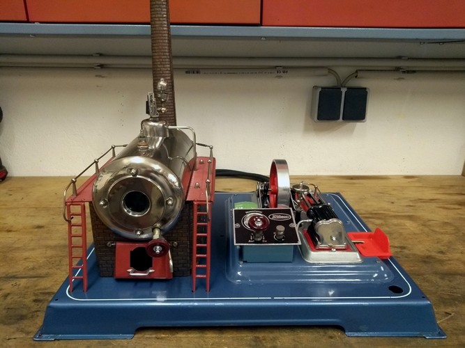 | Die D28 besitzt den ventilgesteuerten, doppeltwirkenden Zylinder der D20/24. Sie hat den zweitgrößten Kessel aus dem Wilesco-Programm, welcher wie bei der D24 verkleidet und isoliert ist. Sie hat auf den ersten Blick große Ähnlichkeiten mit der D24, ist aber im Gesamten größer und besitzt zwei markante Unterschied. Zum einen besitzt sie eine Zwischenplatte für das Antriebsaggregat und Bedientafel. Zum anderen hat sie auf dem Kessel eine Haube, welche den Dampfleitungsanschluss abdeckt und auf dem die Dampfpfeife thront. Sie ist die größte einzylindrige Maschine von Wilesco. Die hier ausgestellte Maschine stammt aus den 70/80'er Jahren. | ||||||||