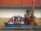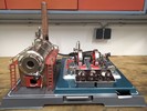 | Die D32 besitzt den gleichen ventilgesteuerten, doppeltwirkenden Zylinder wie die D20/24/28, jedoch gleich zwei davon (der linke in gespiegelter Ausführung). Die D32 ist die größte von Wilesco gebaute Dampfmaschine, ein Wahrer Koloss. Sie hat den größten Kessel des Wilesco-Programms, besitzt einen Drehzahlmesser, Speisewasserpumpe und eine über Reibkupplung zu- und abschaltbare Antriebswelle. Diese Funktionen sucht man bei anderen Modellen von Wilesco vergeblich. Die hier ausgestellte Maschine stammt aus den 60'er Jahren. | ||||||||