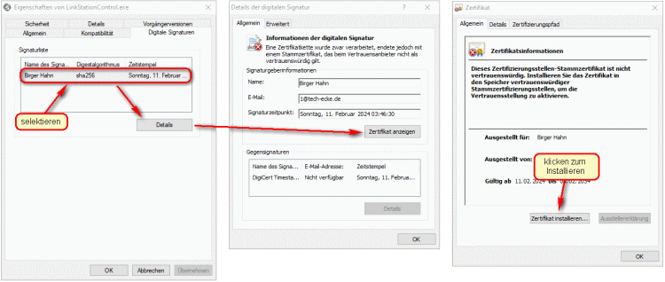 Signatur, klickt dann auf [Details], dann auf [Zertifikat anzeigen] und