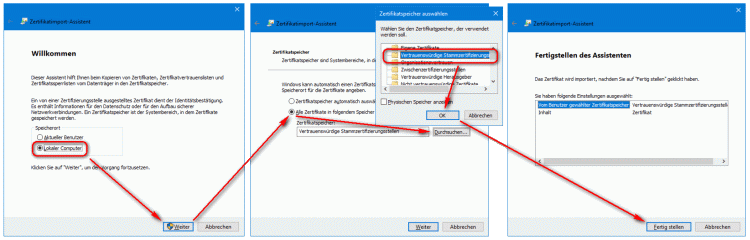 Certificate in Windows unter "Vertrauenswürdige Zertifikate", dann