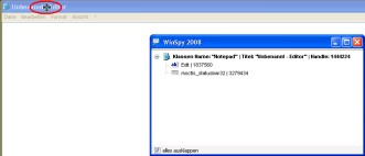 aufbauen kann. Zunächst geht es darum, den Objektnamen bzw. Handle der Anwendung zu finden, bevor man sich an die einzelnen Objekte in der Anwendung zu schaffen macht. OK, nachdem man Notepad (Start/Programme/Zubehör/Editor) und WinSpy gestartet hat, klickt man in WinSpy auf die Pipette (Fenster auswählen), hält die Maustaste gedrückt und zieht das erscheinende Fadenkreuz auf den oberen Fensterrahmen vom Notepad. Bitte nicht in das Eingabefeld!
