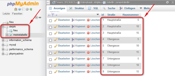 SQLConnection1.Connected := true; SQLQuery1.SQL.Text := 'INSERT INTO meineTabelle(Straße,Hausnummer) VALUES(:s1, :s2)'; SQLQuery1.ParamByName('s1').Value := 'Hintergasse'; SQLQuery1.ParamByName('s2').Value := '5'; SQLQuery1.ExecSQL; SQLQuery1.Close; SQLConnection1.Connected := false; |