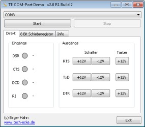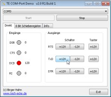 Diese kleine Schaltung demonstriert die Nutzung eines Aus- und Eingangs des COM-Ports. Das Setzen des Ausgangs TxD (Pin 3) bringt die LED 1 zum leuchten. Dazu kann die unten stehende Demo-Software benutzt werden. Wird jetzt der Schalter/Taster S1 geschlossen, so sieht der Eingang DCD (Pin 1) einen High Pegel. Die Software bestätigt dies mit der roten Kontrollfläche bei DCD.