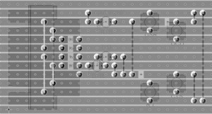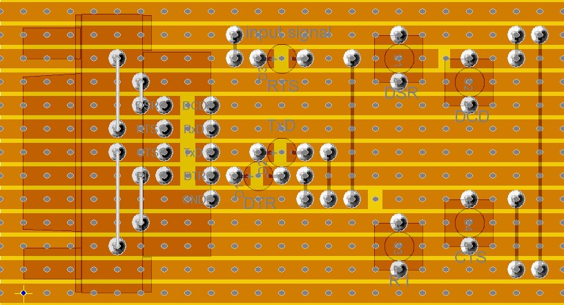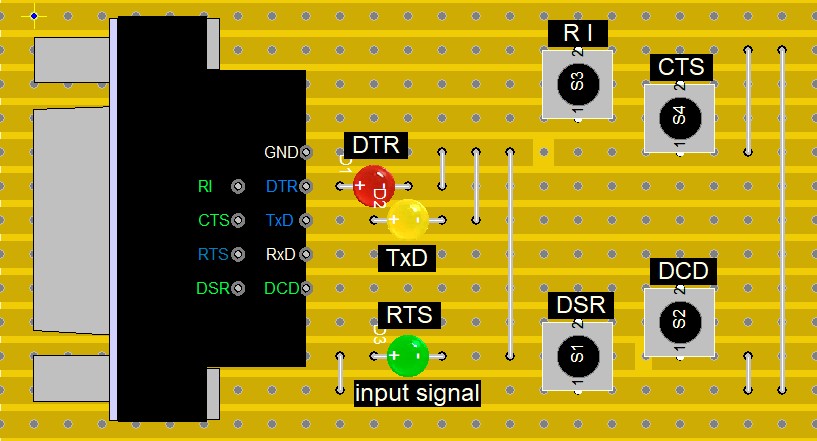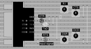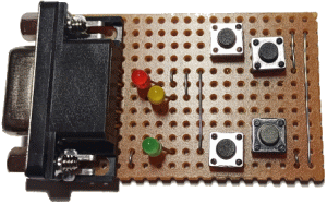 Beim Programmieren und Basteln mit dem COM-Port ist es sehr hilfreich eine Testschaltung zur Hand zu haben. Damit lässt sicht schnell überprüfen ob der COM-Port und das eigene Programm das tut was sie sollen. Hierzu habe ich mir auf einer Lochstreifenplatine folgende kleine Schaltung aufgebaut: