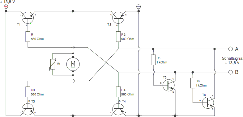 Im oben gezeigten Beispiel findet keine Umpolung statt, von daher könnte hier auch eine ordinäre Schaltdiode zum Einsatz kommen. Ein sinnvoller Einsatz wäre z.B. eine H-Brückenschaltung wie in der folgenden Beispielschaltung gezeigt: