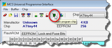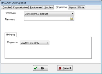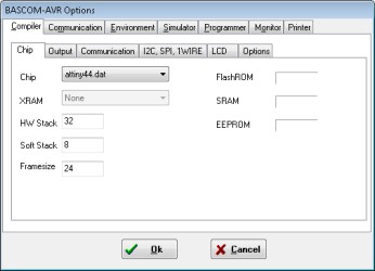 Ich verwende BASCOM IDE v1.11.9.0 zusammen mit dem Programmer myMultiProg V1.06 (LPT), auf einem Windows XP Rechner mit LPT-Port. Dieses Setup ist nur ein Beispiel und es kann prinzipielle jede Programmer/Software-Konfiguration verwendet werden, welche mit dem ATtiny44 kompatibel ist. Beschreiben des ATtiny44A mittels BASCOM und myMultiProg Zum Beschreiben des ATtiny44 kann, wie in meinem Fall z.B. die BASCOM IDE-Entwicklungsumgebung in Verbindung mit einem kompatiblen Programmer verwendet werden. Nach dem Start von BASCOM stellt man zunächst den Programmer über "Options/Programmer" ein. Für den MyMultiProg V1.06 (LPT) wäre das die Einstellung "Universal MCS Interface" und "WinARV and SP12". Dann wechselt man zum Tab "Compiler" und wählt unter "Chip" die "attiny44.dat" für den ATtiny44 aus und bestätigt mit [OK].