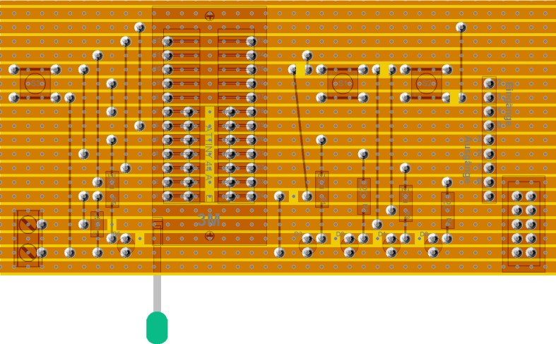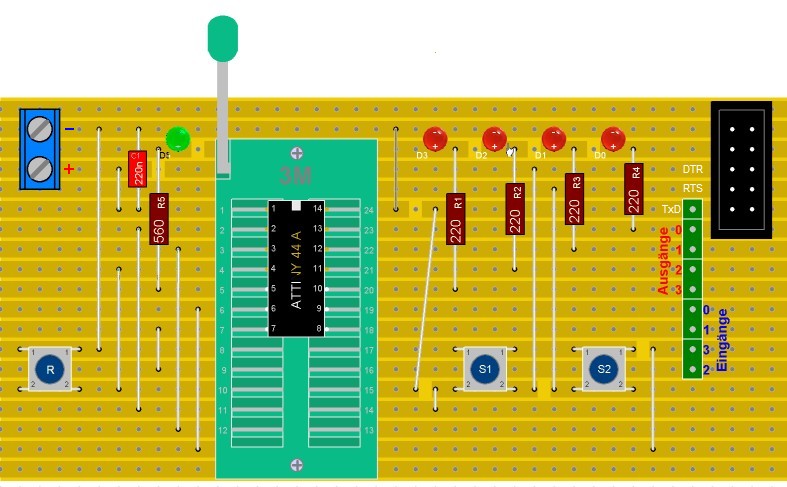 Die Schaltung für das nun benötigte ATtiny44A-TPS-Entwicklungsboard gibt es, wie weiter oben erwähnt auf der Seite von Ralf Beesner. Diese habe ich hier mal auf eine Lochraster-Streifenplatine übertragen.