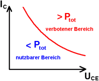Ein Transistor kennt nicht nur den maximalen Kollektorstrom (IC) und die maximale Spannung (UCB/UCE) als Grenzwerte, sondern auch die maximale Verlustleistung (Ptot). Diese berechnet sich wie folgt: P = UCE × IC und sollte nicht dauerhaft über bzw. im Bereich von Ptot liegen. Befindet sich der Transistor über längere Zeit im Bereich von Ptot, wird er überhitzen und dadurch Schaden nehmen. Dies nur am Rande, da das Thema dieser Seite „Der Transistor als Schalter“ ist und in diesem Fall keine Gefahr besteht. Beim Durchschalten wird der Bereich von Ptot zwar kurzzeitig erreicht, jedoch nur für eine sehr kurze Zeit; ansonsten ist entweder IC oder UCE klein und der Bereich wird nicht erreicht. Ein beherzter Bastler rechnet jedoch nicht lange herum, sondern macht Folgendes: Schaltung aufbauen, Finger an den Transistor und Saft auf die Leitung... verbrennt man sich die Finger, sollte man seine Auslegung nochmals überdenken ;-)