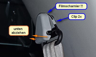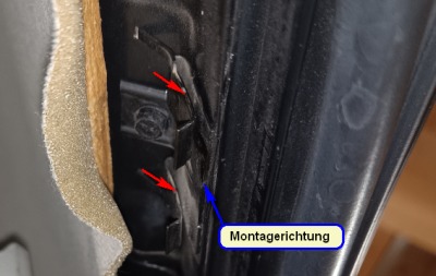 Die A-Säulen- und Dachhimmelblende besitzt 3 befestigungspunkte zur Karosserie. Je zwei Klammern (1) und (2) und eine Einstecklasche in hinterem Bereich (3).