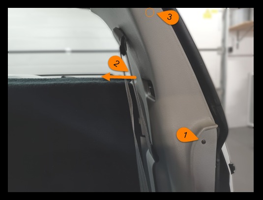 Nachdem man die Befestigungsschraube (1) entfernt hat, muss man die Verkleidung von hinten her etwas in Richtung Fahrzeuginnenraum (2) ziehen und dann in Fahrtrichtung nach vorne und dabei den (verstecken) Tannenbaum-Clip (3) aus der B-Säule ziehen. Jetzt sollte man die obere Nase der Verkleidung über die A-Säulenverkleidung ziehen können.