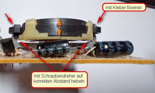 Zur Info, links original Elkos, rechts Ersatz-Elkos mit Werten. Original sind 50V und 10V verbaut, ich habe einheitlich 16V genommen, das tuts auch. Letztlich war die Ursache jedoch, wie so oft bei Elektronikgeräten mal wieder ein mechanisches Problem. Die Membrane des Schallwandlers konnte nicht mehr frei schwingen, weil sich das Oberteil leicht, in Richtung Spule gesetzt hatte. Durch anlegen von +12V auf Pin 7 + 8 und Masse auf Pin 3 bringt man die Box zum Trällern (Licht An Warner). Jetzt kann man das Oberteil mit einem kleinen Schlitzschraubendreher in eine Position hebeln, wo der Ton wieder satt und klangvoll ist. Verkantet man das Oberteil nur ein wenig, so fängt das Teil direkt an zu kratzen. Es waren am Ende nur wenige 1/10 mm die einen enormen Einfluss auf Lautstärke und Klang hatten. Durch das viele Hin- und Herdrücken, Hebeln und Schieben bis der Ton passte, löst sich das Oberteil noch weiter. Darum habe ich es zum Schluss mit zwei Tropfen Sekundenkleber wieder fixiert.