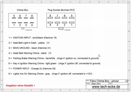 Um das Modul außerhalb vom Fahrzeug testen zu könne habe ich mir eine Übersicht der Pin-Belegung erstellt. Darauf vermerkt sind auch die Eingangsbedingungen um den entsprechenden Ton abspielen zu lassen. Einen Ton für das Anschnallzeichen konnte ich dem Modul nicht entlocken. Mein Fiero (BJ.85) hat auch keinen elektrischen Anschluss am Gurtschloss, der ein "Nicht-Anschnallen" detektieren könnte, von daher bleibt der Pin 4 ein Rätsel. Bei Pin 2 (Anschnallzeichen Armaturentafel) steht nach Einschalten der Zündung ein +12V Signal an. Im Gegensatz zur Anzeige, die nach einigen Sekunden wieder erlischt bleibt das Signal jedoch bestehen. Gemessen habe ich das im ausgebautem Zustand, entweder fehlt der Elektronik die Last der Kontrollleuchte oder das Ausschalten geschieht an anderer Stelle. Jedenfalls bleibt das Anschnallzeichen bei gezogenem Modul komplett dunkel.