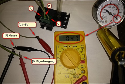 Zum einen kann man die Funktion über ein Diagnosetool wie WinALDL prüfen indem man sich die Werte bei Zündung an, Motor aus und im Standgas anschaut. WinALDL gibt für den MAP Sensor die aktuelle Messspannung aus. Diese sollte, wenn man sich nicht gerade hoch oben in den Alpen befindet nahe bei 5V liegen. Wenn der Motor im Standgas läuft sollte sich der Wert bei 1 - 1,5V befinden und bei laufendem Motor und weit geöffneter Drosselklappe bei 4-4,5V. Der Sensor lässt sich auch mittels Labornetzteil, Multimeter und Vakuumpumpe auch außerhalb vom Fahrzeug testen. Hierzu legt man +5V vom Labornetzteil auf den Anschluss [C] (graues Kabel) und Masse auf den Anschluss [A] (schwarz/rotes Kabel). Nun misst man die Spannung am Anschluss [B] (grünes Kabel), hier sollten ein Wert in der Nähe von 5V erscheinen. Nun schließt man die Vakuumpumpe über einen Schlauch am Messstutzen des Sensors an und erzeugt dort ein Unterdruck von 20 in Hg (680 mbar). Jetzt sollte der Messwert bei 1,1V liegen, diese Messung ist Höhenmeter (aktueller Atmosphärendruck) unabhängig.