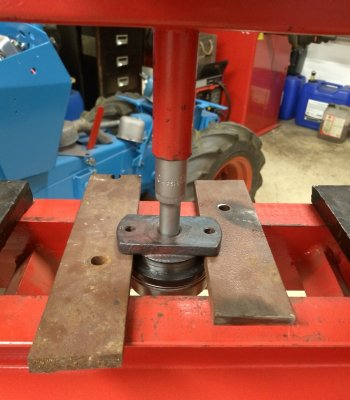 Wie um alles in der Welt bekomme ich das Lager 6208 zwischen dem festen (nicht gesteckten) Gelenkwellenflansch und dem Zahnradpaar (orig. Ritzel) am 1030-Getriebe (ältere Ausführung) demontiert? Auf den ersten Blick nicht ganz ersichtlich: Der Gelenkwellenflansch ist auf das Ritzel aufgepresst. Dies muss zunächst auf einer Presse ausgepresst werden; mit einem Abzieher kommt man an dieser Stelle nicht mehr weiter. Das Bild zeigt einen möglichen Aufbau. Als Auspressdorn kann man z. B. eine 10-mm-½“-Langnuss verwenden, diese passt perfekt.