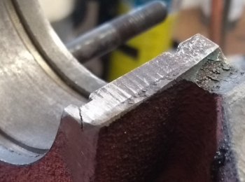 Um das Kugellager 6204N (mit Nut) vom Schaltblock (auf der Schaltwelle) abzuziehen, muss auch das davor sitzende Zahnrad abgezogen werden. Man kommt eventuell auf den Gedanken, dass man beides auf einmal abziehen könnte, also quasi den Abzieher am Kugellager ansetzt und Lager plus Zahnrad auf einmal packt. Aber das Zahnrad besitzt eine Passfeder, an der der Innenring des Lagers nach wenigen Bewegungen zum Stehen kommt. Gibt man dann noch mehr Kraft drauf, beginnt sich der Innenring in die Passfeder einzugraben … nicht schön.