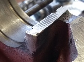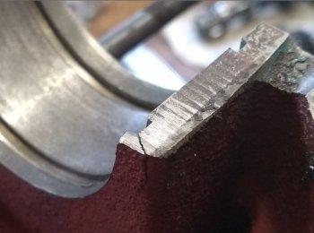 Bitte auch unbedingt die Lagersitze des Schrägkugellagers im Bereich des inneren Sicherungsrings auf Anrisse untersuchen. Die Schneckenwelle erfährt im Betrieb eine hohe Axialkraft, welche über die beiden Sicherungsringe abgefangen werden muss. Insbesondere die zur Getriebeinnenseite liegende Ringnut reißt aufgrund der schwachen Wandstärke gerne aus. Ist ein Anriss zu erkennen, dann empfiehlt es sich unbedingt diesen zu löten, bevor es zu einem größeren Schaden kommt – >>> siehe hier <<<. Hierzu eignet sich sehr gut „Neusilber“, mit einem Schmelzpunkt von 670 °C.