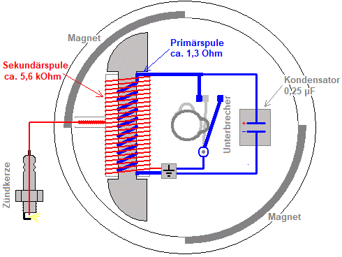 Durch das Rotieren der im Polrad befindlichen Magnete wird ein schwingendes, also sich änderndes Magnetfeld über den Zündanker zur Primärspule geleitet. Dadurch wird ein Strom in die Spule induziert, welcher über den zunächst noch geschlossenen Unterbrecherkontakt direkt gegen Masse fließt. Es besteht also ein geschlossener Stromkreis. Aufgrund des geschlossenen Kreislaufs verstärkt sich das Magnetfeld um die Primärspule, bis sich der Unterbrecherkontakt und somit der Stromkreis öffnet und das Magnetfeld daraufhin zusammenbricht. In dem Moment entsteht durch die Selbstinduktion der Spule eine Spannungsspitze. Da die Sekundärspule um die Primärspule herumgewunden ist, wird sie vom gleichen Magnetfeld beeinflusst. Jedoch aufgrund der deutlich höheren Windungszahl ist hier die induzierte Spannung um ein Vielfaches höher als in der Primärspule und erreicht Spannungen von 20.000 Volt und mehr. Kommen wir nun zu den Aufgaben des Zündkondensators. Wie gesagt, entsteht beim Ausschalten (Öffnen des Unterbrecherkontakts) der Spule eine Spannungsspitze. Diese Spannung wäre bereits in der Primärspule groß genug, um die Luftstrecke am sich öffnenden Unterbrecherkontakt zu überspringen. Somit würde der Strom, wenn auch vermindert, dennoch etwas weiterfließen und sich das Magnetfeld dadurch langsamer abbauen. Zum einen hätte dies einen negativen Effekt auf die Resonanzschwingung der beiden Spulen, zum anderen würde der Unterbrecherkontakt aufgrund der Funkenbildung schnell verschleißen (ausfeuern). Der parallel zum Unterbrecherkontakt geschaltete Kondensator nimmt die Spannungsspitzen beim Öffnen auf und gibt seine Ladung wieder bei geschlossenem Kontakt in den Stromkreis ab.Das Ganze erklärt alle physikalischen Abläufe zugegebenermaßen nur lückenhaft, aber an dieser Stelle sollte dies zum groben Verständnis ausreichen.