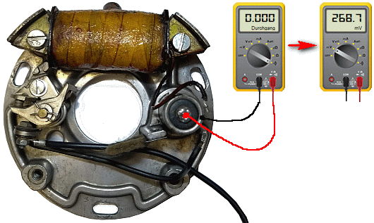 In aller Regel sieht man dem Kondensator rein optisch nicht an, ob er defekt ist – man muss also messen. Wie bei der Zündspule benötigt man auch beim Kondensator ein LC-Meter, um dessen Kapazität zu messen. Bevor man den Kondensator durchmessen kann, muss die Zündspule und am besten auch gleich der Unterbrecherkontakt abgeklemmt werden (letzterer ist in der Regel gelötet). Ist der Unterbrecherkontakt noch angeschlossen, so muss dieser für den Messvorgang geöffnet sein. Der gemessene Wert sollte 0,25 µF betragen. Da ein LC-Meter nicht zur Grundausstattung eines Hobbyhandwerkers gehört, kann man sich auch hier wieder mit einem handelsüblichen Multimeter behelfen. Zunächst stellt man das Multimeter auf Durchgangsprüfung ein und setzt die Plus-Messspitze auf den Löt- bzw. Schraubanschluss des Kondensators und die Minus-Messspitze an das Kondensatorgehäuse. Der Prüfstrom wird nun den Kondensator laden. Nach wenigen Sekunden stellt man das Multimeter, bei weiterhin anliegenden Messspitzen, auf mV (Millivolt) Gleichstrommessung um. Jetzt sollte man einen Wert messen, der stetig abnimmt. Ist dies der Fall, so kann man zumindest die Aussage treffen, dass dieser noch Kapazität aufnehmen kann. Ob diese jedoch ausreichend ist, bleibt offen. Zumindest lässt sich so ein komplett ermüdeter Kondensator bestimmen. Eine Vergleichsmessung mit einem funktionsfähigen Kondensator wird die Aussagekraft dieser Behelfsmessung definitiv verbessern.