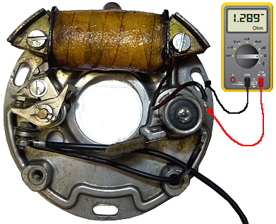 Die Zündspule besitzt, wie oben beschrieben, eine Primär- und eine Sekundärwicklung.Die Sekundärwicklung (Hochspannungsseite) lässt sich im eingebauten Zustand relativ einfach mit einem Multimeter messen. Hierzu am besten den Kerzenstecker vom Zündkabel abdrehen und direkt zwischen Zündkabel und Motormasse messen. Es sollte sich ein Wert von ca. 5,6 kOhm einstellen. Mit dieser Messung lässt sich jedoch nicht eindeutig bestimmen, ob die Spule nicht doch einen Schaden hat. Zum einen könnte die Spule einen Bruch haben, der sich erst zeigt, wenn sich die Spule erwärmt und sich infolge die Bruchstelle „öffnet“. Zum anderen kann auch eine beschädigte Spulendrahtisolierung (z. B. durch hohe Hitzeeinwirkung) einen Fehlfunken hervorrufen. Hier sollte man ebenfalls die Symptome des Motors mitbetrachten. Ein unendlicher Widerstand, also „0“ auf dem Messgerät, zeigt hingegen relativ verlässlich eine defekte Spule an. Bei einem abweichenden Widerstandswert könnte man auch die Induktivität der Spule messen, welche letztlich die Haupteigenschaft einer Spule ist. Hierzu benötigt man jedoch ein spezielles Messgerät (LC-Meter), das man in aller Regel nicht im Baumarkt seines Vertrauens und nicht für schmales Geld bekommt. An der Sekundärspule sollte ein Wert von ca. 10 H (Henry) gemessen werden.Die Primärwicklung lässt sich leider nicht im eingebauten Zustand messen, hierzu muss der Spulenausgang zuvor vom Kondensator getrennt werden (i. d. R. gelötet). Der Widerstand, gemessen am Spulenausgang gegen Masse, sollte ca. 1,3 Ohm betragen. Am LC-Meter sollte man einen Wert von ca. 6 mH ermitteln.